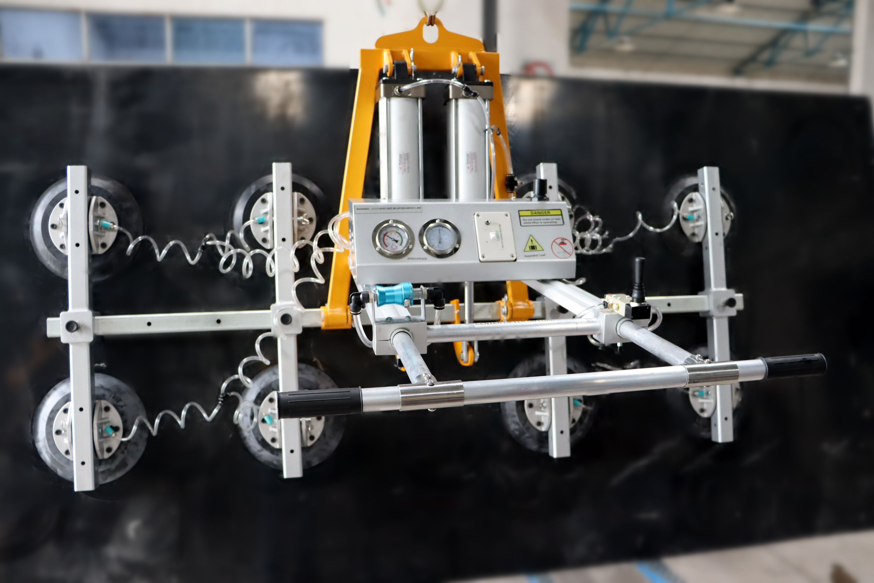 This vacuum lifter is designed to lift smooth or rough marble and granite slabs. Pneumatic vertical-horizontal tilting 0 to 90°.